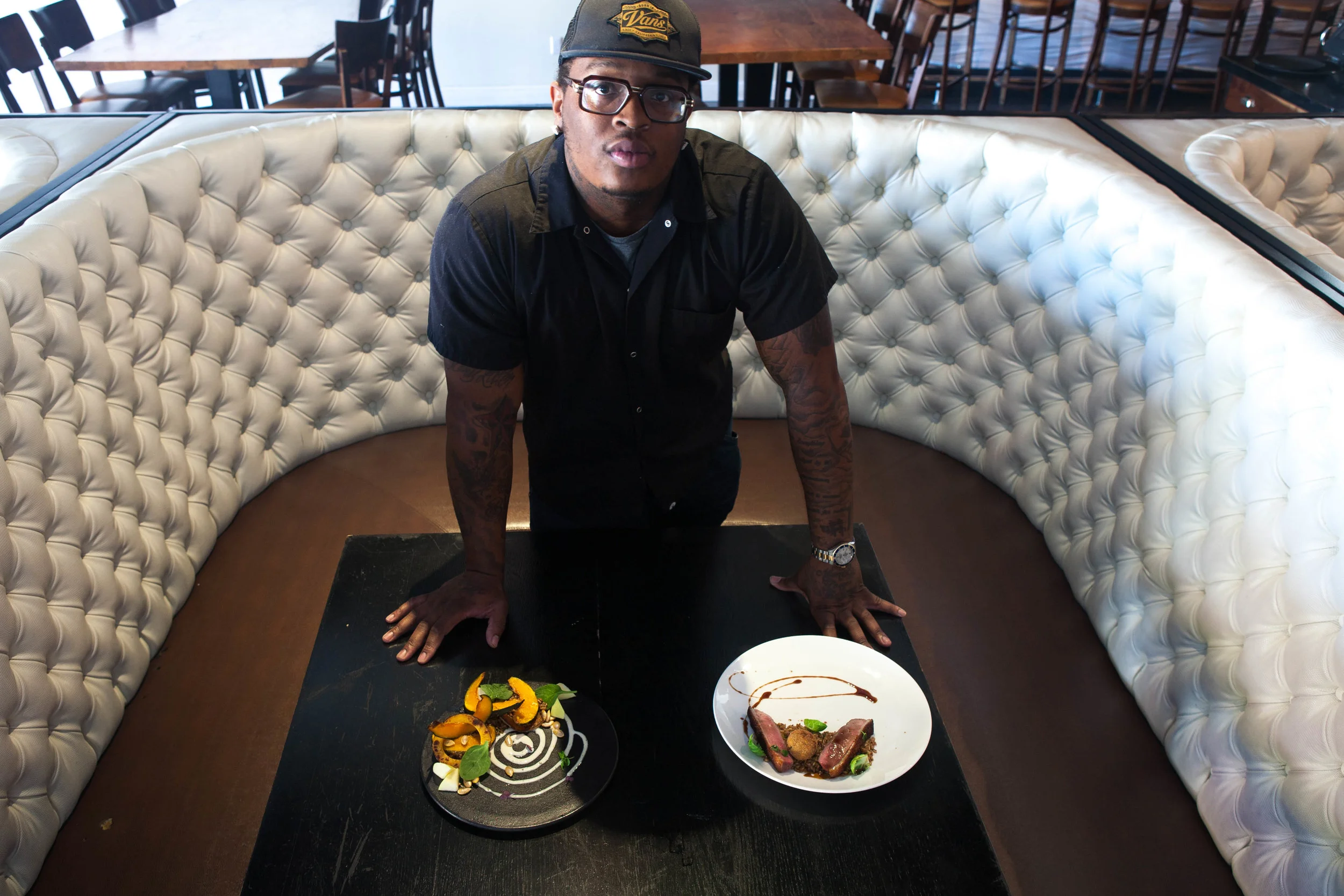 Hanging with 28-year-old Chef Akins Amoroso at Milk River restaurant in Brooklyn, NY, with the collage of Biggie, Jay Z and Nas hovering over his head in the background, it felt more like an exploration into hip hop culture as opposed to food. Looking past his Vans cap, Run DMC inspired eyewear, and tatted skin we heard those familiar notes of passion as he shared his culinary aspirations, inspirations and a love affair with food. The tattoos on his right hand say it all: a nod to a Michelin recommendation 3 years in a row achieved for his skills at one of his restaurant bases, Elberta, and of course "live to cook" his every day mantra.